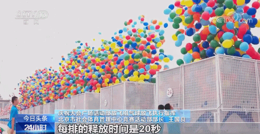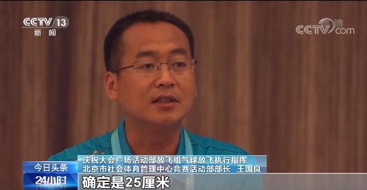 庆祝大会广场活动部放飞组气球放飞执行指挥 北京市社会体育管理中心竞赛活动部部长 王国良:这也是根据九三阅兵、(国庆)七十周年放气球的经验,确定是25厘米。如果气球太大的话,经过高温炙烤就有可能爆炸。如果太小了,打完气之后再过4个小时,可能就会损失掉一部分氦气,导致气球的升空能力下降,有可能飞不起来。