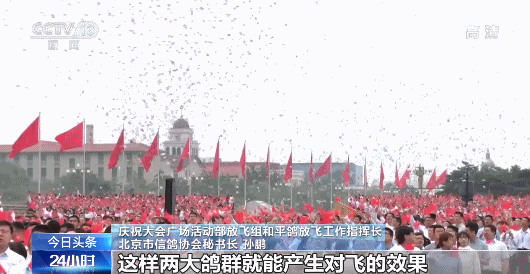 庆祝大会广场活动部放飞组和平鸽放飞工作指挥长 北京市信鸽协会秘书长 孙鹏:把从北京地区东侧(收来)的鸽子放在广场西侧,把从北京西边收上来的鸽子放在广场东侧,这样两大鸽群就能产生对飞的效果。 信鸽归家是靠它们的(飞行)特性的,同时它们是靠太阳和地(球)磁(场)定位的,如果当天天气非常晴朗,它们可能盘旋一圈就各自归家了,而七一当天正好天安门广场是多云的情况,鸽子定位时有可能不是很准,所以会多盘旋几圈,于是就形成了万鸽盘旋的景象。