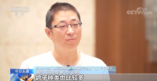庆祝大会广场活动部放飞组和平鸽放飞工作指挥长 北京市信鸽协会秘书长 孙鹏:10万羽和平鸽全部是信鸽,鸽子种类也比较多,分家鸽、观赏鸽、信鸽,家鸽一般是不飞的,(我们)主要收的都是成鸽。成鸽是两年以上的信鸽,也都是参加过重大比赛活动的信鸽。这十万羽和平鸽有的还可以参加比赛,但是大部分都退役做了种鸽。