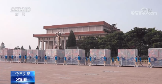 七一当天,100只球笼顶盖同时打开,天安门广场南侧有10万只气球腾空而起,色彩斑斓,形成一条彩色长龙。