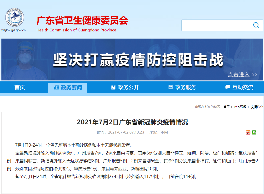 7月2日0—24时,广东省无新增本土确诊病例和本土无症状感染者。