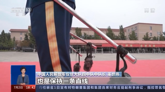 中国人民解放军仪仗大队四中队中队长 董世伟:对,我们刀鞘上挂水壶,主要是为了在我们站立过程中,使刀鞘保持一条直线,我们三个人刀鞘角度保持一致,形成肌肉记忆,等我们把水壶拿掉的时候,会更加整齐,就会更轻松一些。