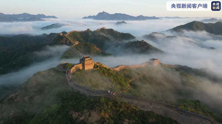 站在长城之巅,360度云海气势恢宏,一会儿波涛汹涌似蛟龙出海,一会儿又像轻歌曼舞仙女浣纱,神秘莫测,宛如人间仙境。飘渺的雾气弥漫在山谷,随着阳光的照射,如同金黄的薄纱,变幻流动、霞光异彩,于晨光云海间金山岭长城尽显壮美。(总台记者 郭晓平 祁文杰)
