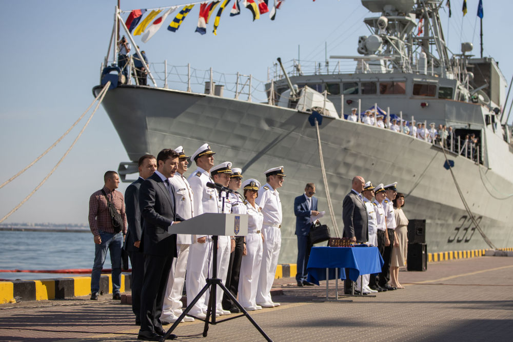 2019年7月7日,乌克兰总统泽连斯基(前排左一)在乌南部敖德萨港视察“海上微风-2019”联合军演时发表讲话。(新华社发,乌克兰总统办公厅提供)