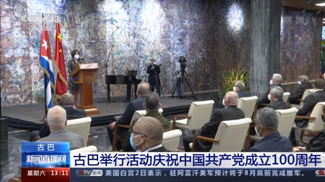 总台记者 侯佳琦:这里是哈瓦那革命宫,是古巴接见外国政要、举行授勋仪式或举办非常重要的政治文化活动的地点,再过几分钟,古巴共产党将在这里举行隆重活动,庆祝中国共产党成立100周年。