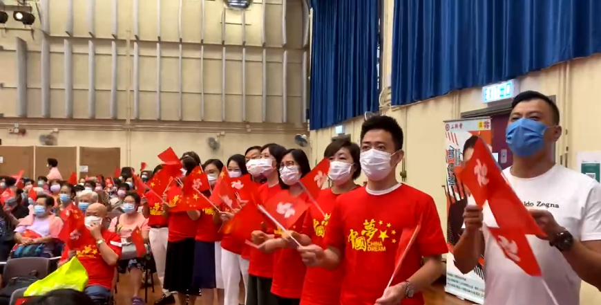 其中,在香港岛南区的华富邨里,市民们在社区中心高唱《没有共产党就没有新中国》《歌唱祖国》等昂扬奋进的经典歌曲,并挥舞国旗和区旗,现场气氛热烈。