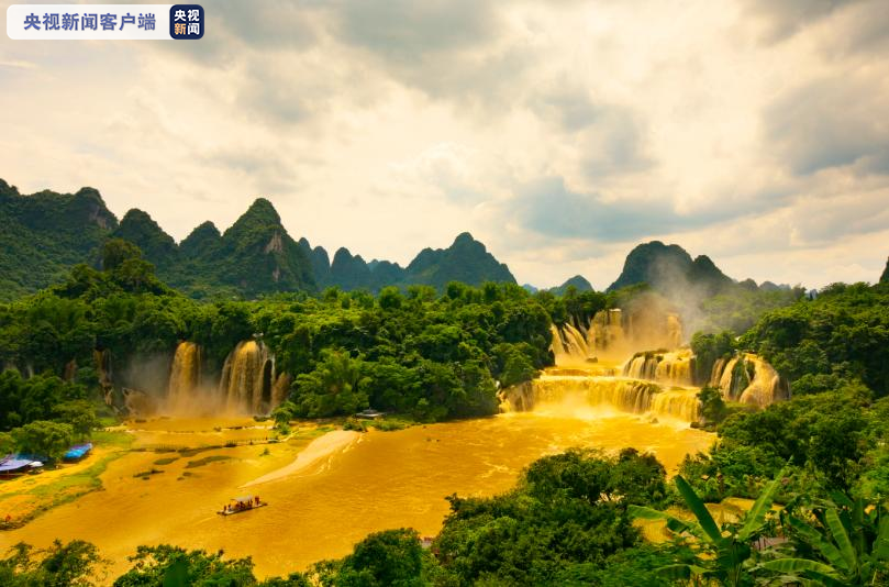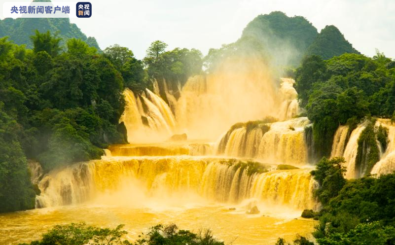 近日,受高空槽、西南急流共同影响,广西部分地区出现大雨到暴雨,局部特大暴雨。受强降雨及上游来水影响,地处中越边境的德天跨国瀑布景区水量暴涨,水流速加快,清澈的瀑布呈现金黄色,形成了难得一见的“黄金瀑布”奇观。