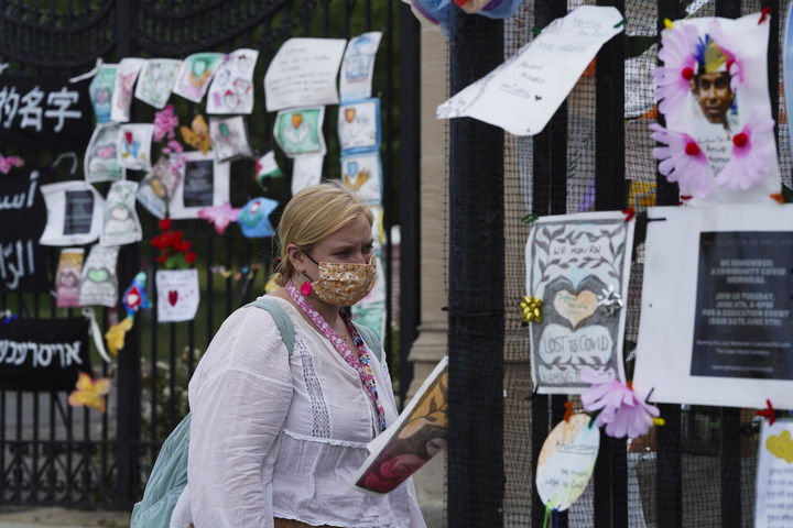 6月14日,一名女子在美国纽约一处墓地外为新冠死者设立的纪念装置旁驻足。新华社记者王迎摄