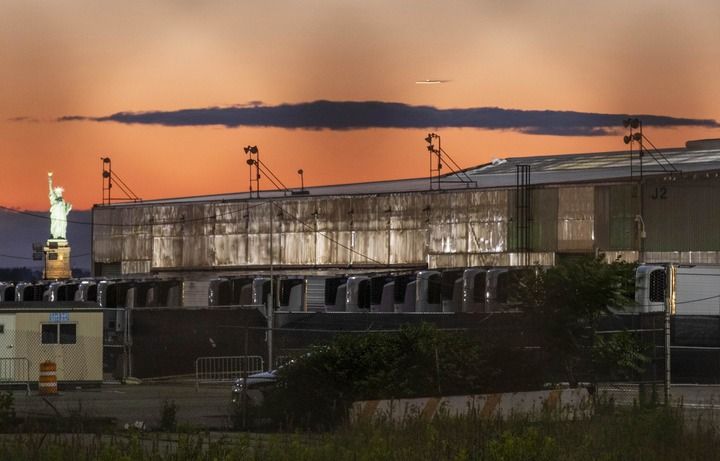 6月15日,在美国纽约布鲁克林,存放新冠患者遗体的冷藏车停放在一处临时停尸场内。新华社记者王迎摄