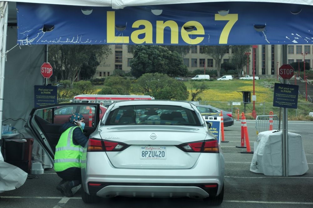 4月29日,在美国加利福尼亚州旧金山城市学院的新冠疫苗接种点,市民通过“得来速”的方式不下车接种疫苗。(新华社记者吴晓凌摄)