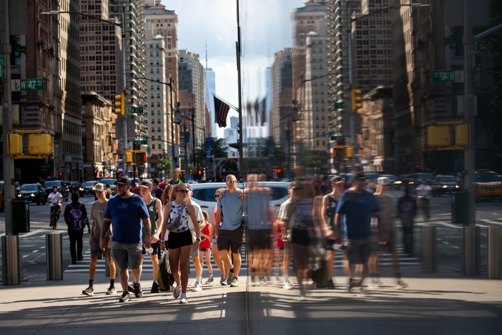 6月15日,人们走在美国纽约街头。(新华社发,郭克摄)
