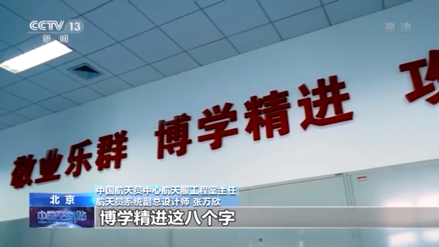 中国航天员中心航天服工程室主任、航天员系统副总设计师 张万欣:这是我们的实验室,您看墙上这几个字,然后前面是敬业乐群、博学精进这八个字,是我们的一个室训,因为我们的工作压力非常大,也非常艰苦,所以我们要提倡整个队伍是一个快乐的工作、快乐的生活。