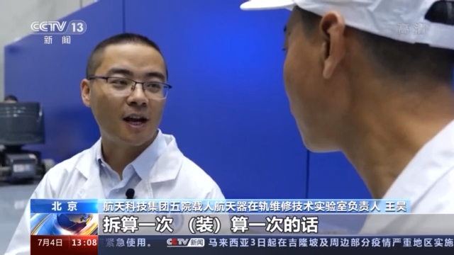 航天科技集团五院载人航天器在轨维修技术实验室负责人 王昊:拆算一次,卸(装)算一次的话,就是干15次螺丝。航天员A是作业的主要实施者,航天员B主要是做拔电缆和插电缆的操作。航天员A是在机械臂上把所有的螺钉拆了,把全景摄像机换下来,包括再安支架、再拧螺钉。说起来有点简单,但实际上整个的流程大概需要一个小时。