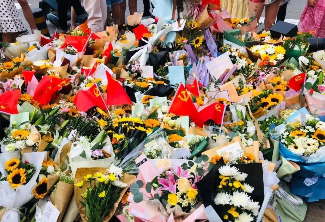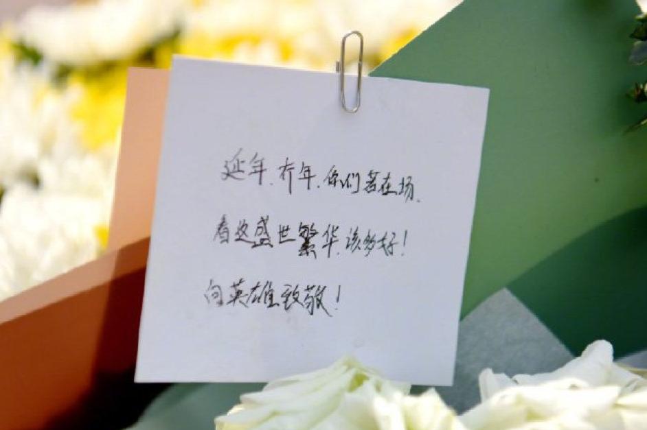夹在花束中的卡片写满了市民对两位烈士的缅怀之情,其中有不少卡片上的留言让无数网友直呼“破防了”。