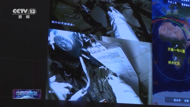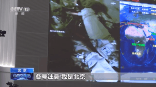 总台央视记者 刘冠青:现在在我身后的这块屏幕上,可以看到现在航天员正在穿着舱外航天服,接下来他们进行航天服的检查之后,将会开始进行打开舱门的操作。在另外一块大屏上天链卫星的测控区域比平时要大了很多,这个就是为了保证航天员在出舱过程中,有长时间的测控弧段,确保我们能够在地面上实时监控到航天员的状态。