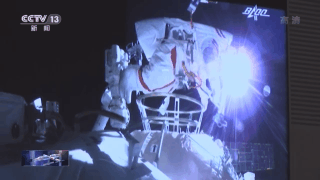 现在我们看到的这个角度是两位航天员在航天服上的摄像头拍到的。