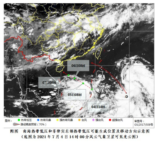 海南省气象台预计,受南海热带低压影响,7月5—7日,南海东南部、西沙和中沙海域、海南岛东部海面、琼州海峡、北部湾海面和海南岛西部海面,先后将有强风雨天气;6—7日,海南岛陆地将有较强风雨。