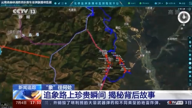 这是云南省森林消防总队指挥中心亚洲象搜寻监测平台,系统显示的一个个红点和一条蓝色线条,红点就是无人机监测的实时坐标点,而这条蓝色的线条就是象群的行动轨迹。
