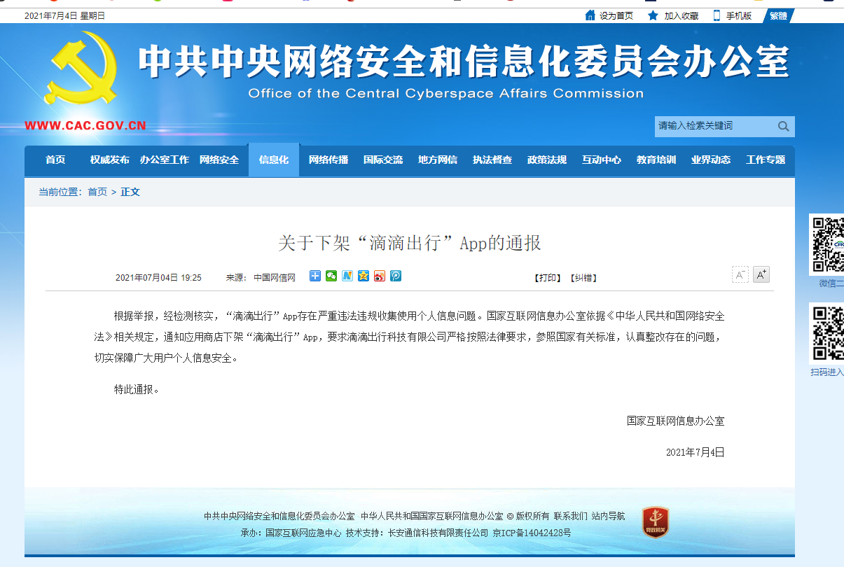 据网信办官网消息,根据举报,经检测核实,“滴滴出行”App存在严重违法违规收集使用个人信息问题。国家互联网信息办公室依据《中华人民共和国网络安全法》相关规定,通知应用商店下架“滴滴出行”App,要求滴滴出行科技有限公司严格按照法律要求,参照国家有关标准,认真整改存在的问题,切实保障广大用户个人信息安全。