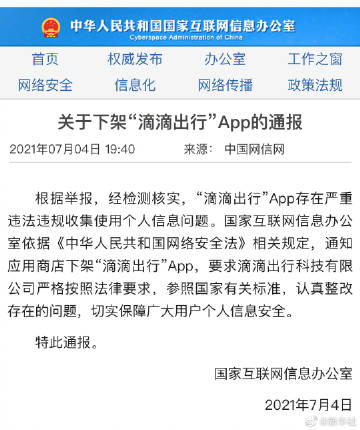 【国家网信办:“滴滴出行”App下架】国家网信办4日发布通报称,根据举报,经检测核实,“滴滴出行”App存在严重违法违规收集使用个人信息问题。国家互联网信息办公室依据《中华人民共和国网络安全法》相关规定,通知应用商店下架“滴滴出行”App,要求滴滴出行科技有限公司严格按照法律要求,参照国家有关标准,认真整改存在的问题,切实保障广大用户个人信息安全。