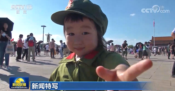 这个小姑娘来自一个军人世家,今天祖孙三代一起来到天安门广场瞻仰庆祝大会现场盛况,妈妈特意给她穿了一身“军装”,俨然就是一位小军人。