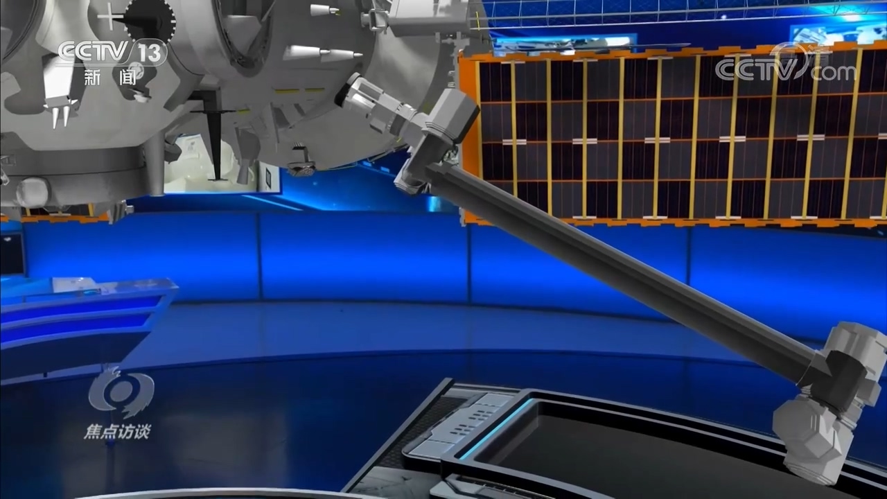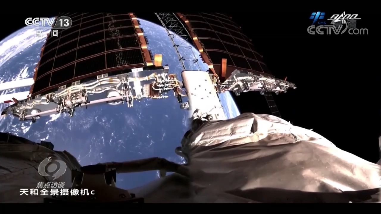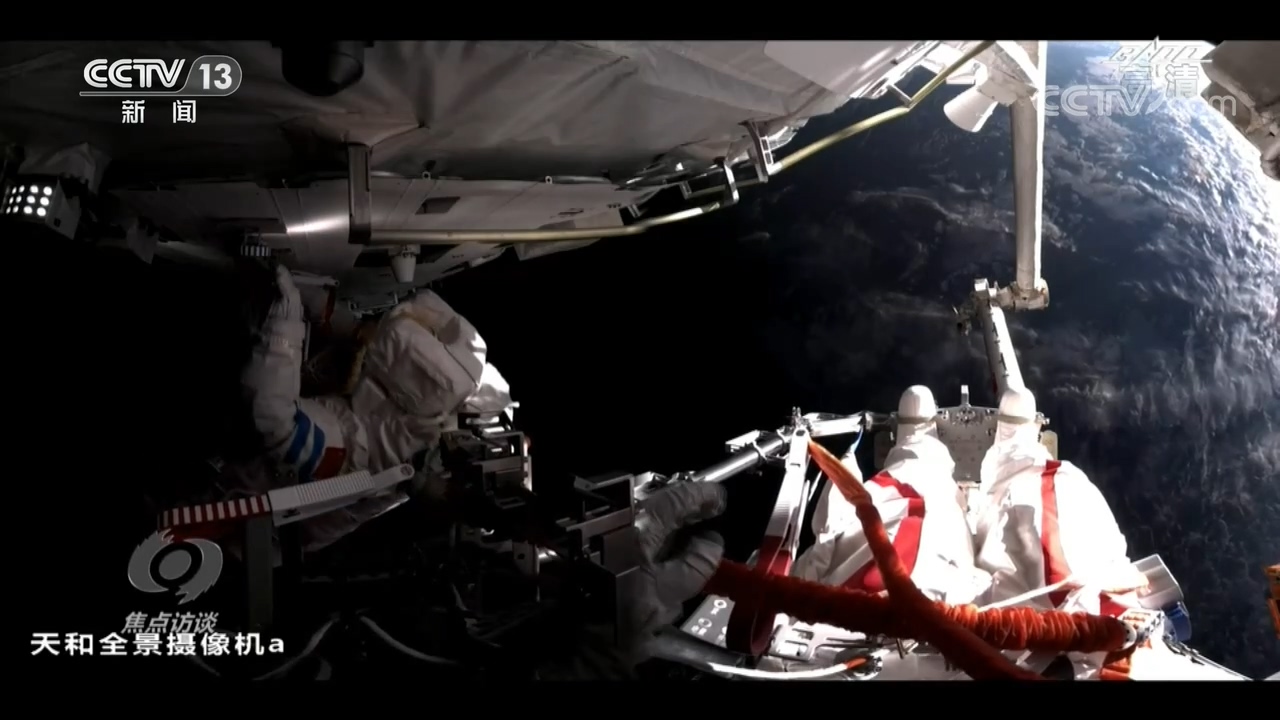 央视网消息(焦点访谈):7月4日,中国航天员时隔13年再次出舱,漫步太空。这张图片就是航天员在空间站核心舱外站在机械臂上工作的样子。这一次出舱时间将近7个小时,圆满完成了舱外活动相关设备组装、全景相机抬升等任务。两位出舱的航天员刘伯明和汤洪波与留在舱内的指令长聂海胜和地面飞行控制人员配合默契,圆满完成了这次的出舱活动任务。而在他们成功完成任务的背后,是一个又一个精巧的设计。