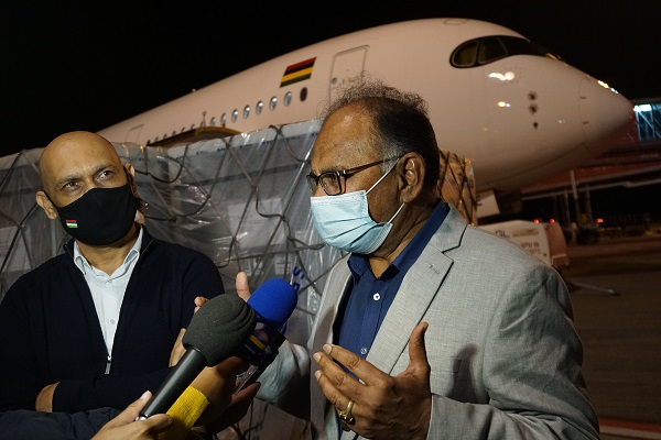 当地时间7月4日晚,第三批中国国药新冠疫苗运抵毛里求斯西沃萨古尔·拉姆古兰爵士国际机场。毛外交部长艾伦·加努、卫生部长贾古特帕尔亲自前往机场迎接。