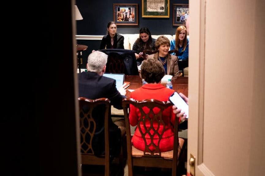 △白宫官员和部分中间派参议员讨论基建方案细节。(图片来源:《纽约时报》)