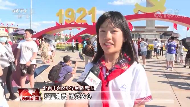 北京丰台区小学生 陈思洁:我感觉党徽非常大,而且非常有能量感,感觉中国非常的伟大。庆典当天我印象深刻的就是那八个字:强国有我,请党放心。