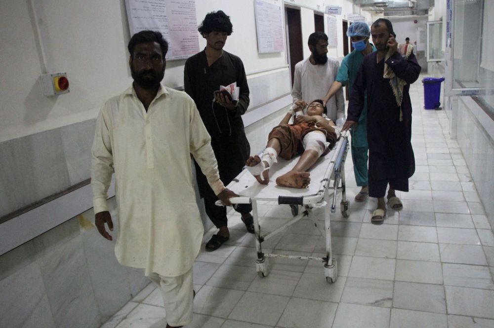 7月3日,人们在阿富汗拉格曼省米特拉姆一家医院运送受伤的儿童。(新华社发,塞夫拉赫曼·萨菲摄)