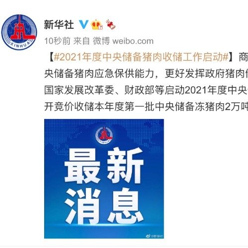 【#2021年度中央储备猪肉收储工作启动#】商务部5日发布消息,为切实增强中央储备猪肉应急保供能力,更好发挥政府猪肉储备调节作用,近日,商务部会同国家发展改革委、财政部等启动2021年度中央储备猪肉收储工作,定于7月7日公开竞价收储本年度第一批中央储备冻猪肉2万吨。(记者于佳欣)