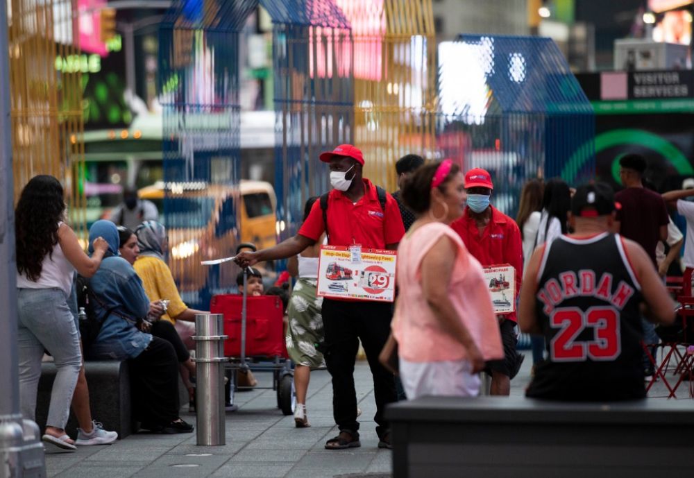 7月2日,观光大巴推销员在美国纽约时报广场上向游客推荐线路。(新华社记者王迎摄)