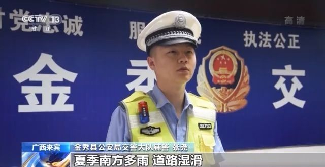 金秀县公安局交警大队辅警 张尧:夏季南方多雨,道路湿滑,驾驶人在途经易积水路段时一定要减速慢行,保持好方向,切勿猛踩刹车,猛打方向。