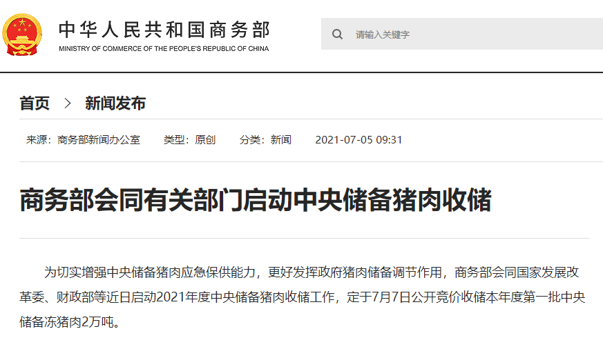 商务部7月5日发布公告,为切实增强中央储备猪肉应急保供能力,更好发挥政府猪肉储备调节作用,商务部会同国家发展改革委、财政部等近日启动2021年度中央储备猪肉收储工作,定于7月7日公开竞价收储本年度第一批中央储备冻猪肉2万吨。(总台央视记者 徐宁宁)