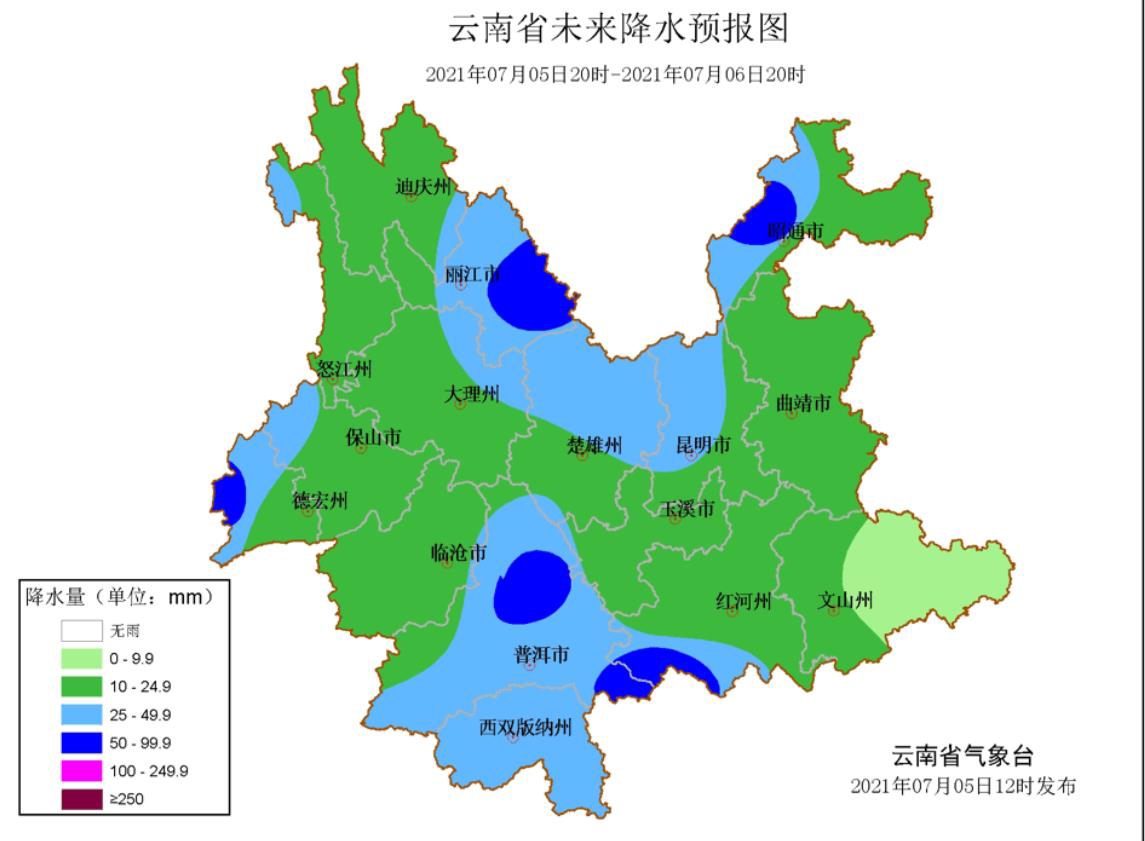 预计7月5日夜间至6日云南省大部分地区有中雨,其中昭通、昆明北部、楚雄北部、丽江、怒江北部、保山北部、德宏、普洱中东部有大雨、暴雨。伴随降水,滇西北东部、滇西、滇西南、滇中、滇东南、滇东、滇东北将出现雷暴、短时强降水及局地冰雹等强对流天气,需防范局地强降雨引发的山洪、地质灾害。
