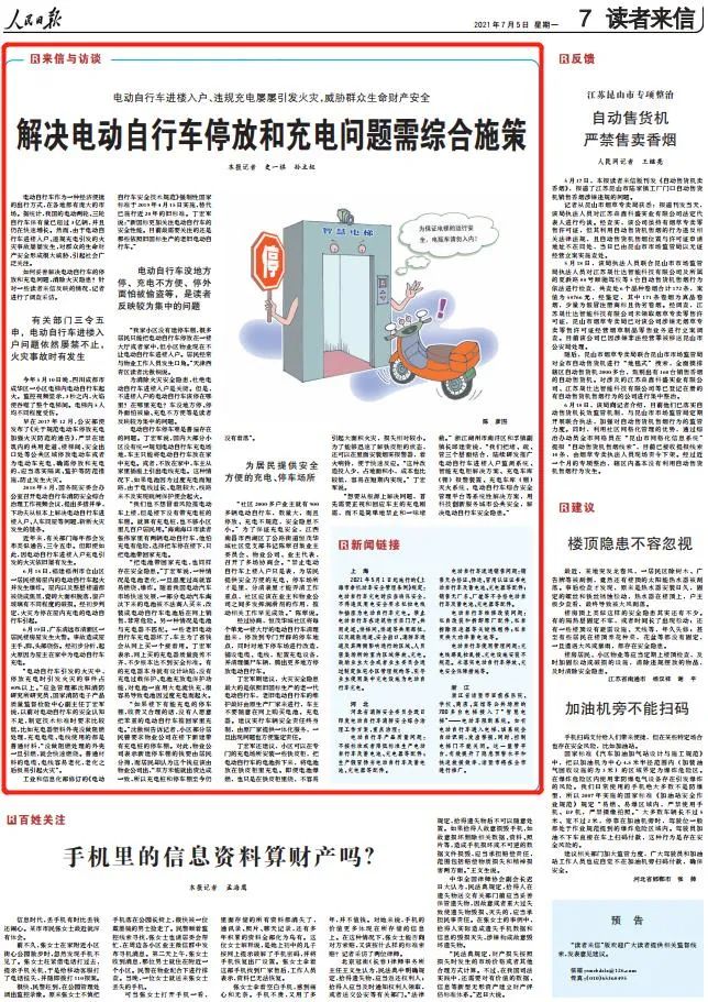 电动自行车没地方停、充电不方便、停外面怕被偷盗等,是读者反映较为集中的问题