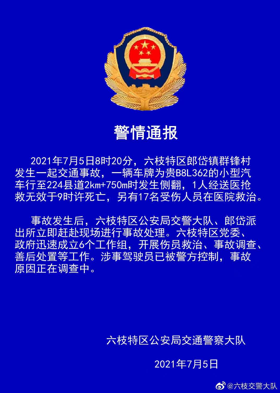 据贵州六盘水市六枝特区公安局交通警察大队官方微博消息:2021年7月5日8时20分,六枝特区郎岱镇群锋村发生一起交通事故,一辆车牌为贵B8L362的小型汽车行至224县道2km+750m处时发生侧翻,1人经送医抢救无效于9时许死亡,另有17名受伤人员在医院救治。目前,涉事驾驶员已被警方控制,事故原因正在调查中。