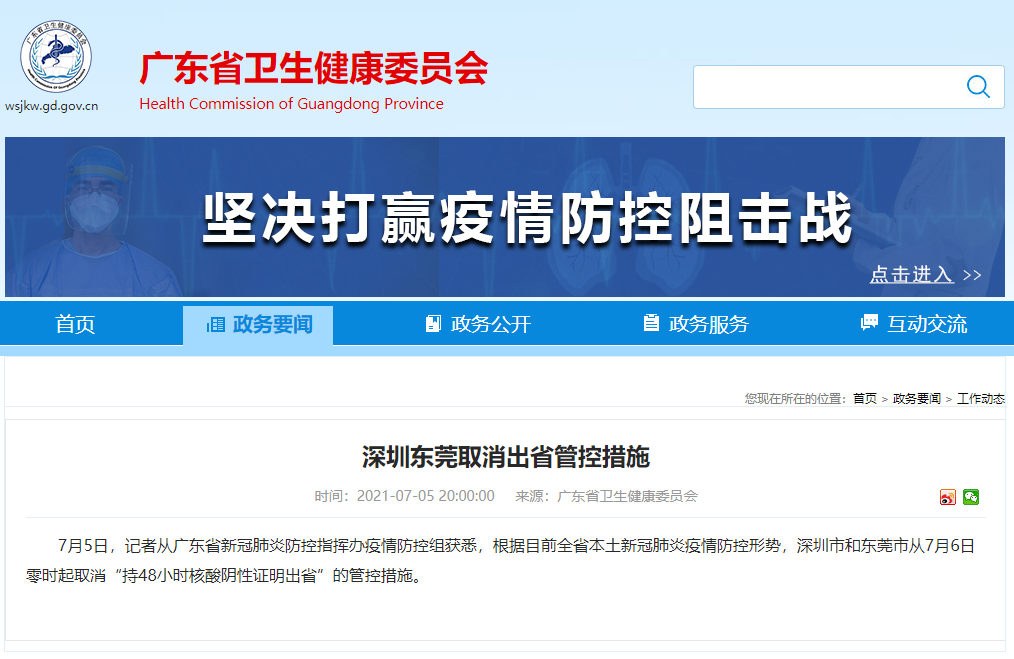 7月5日,广东省卫健委发布消息,根据目前广东省本土新冠肺炎疫情防控形势,深圳市和东莞市从7月6日零时起取消“持48小时核酸阴性证明出省”的管控措施。