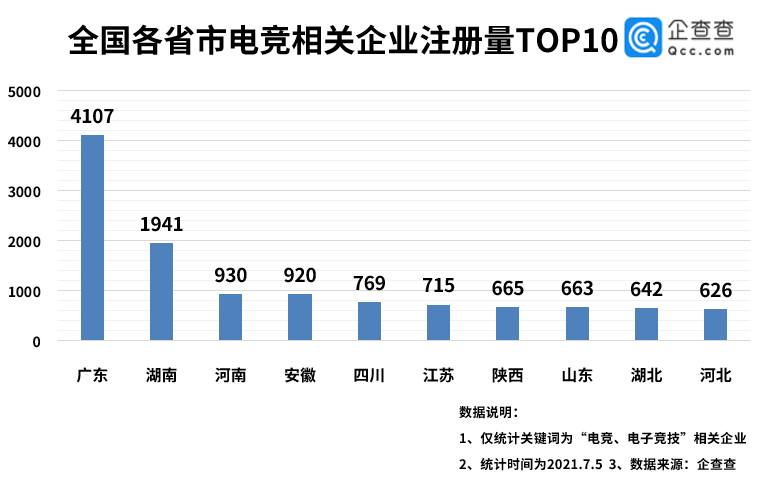 从地域分布来看,广东省以2017家位列榜首,湖南省以1941家位列第二,河南省以930家位列第三。在国内收入前10的移动竞技游戏中,有9款由广东游戏企业研发或运营,从推动电竞行业发展的“源动力”层面,来自广东的游戏企业无疑是最强烈的。此外,从对产业认知度上,广东对游戏产业的认可,也能够降低电竞产业文化在广东推广的市场培育成本。