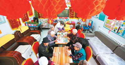 5月21日,河北省张家口市万全区孔家庄街道气象后街社区阳光家园托养中心工作人员在陪老人玩益智游戏。