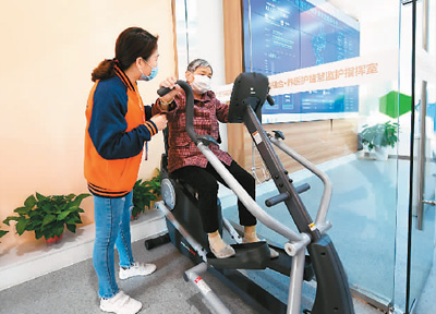 5月19日,在浙江嘉兴秀洲区王店镇家院融合养医护智慧照料中心,83岁的胡秀珠老人在工作人员指导下进行康复训练。