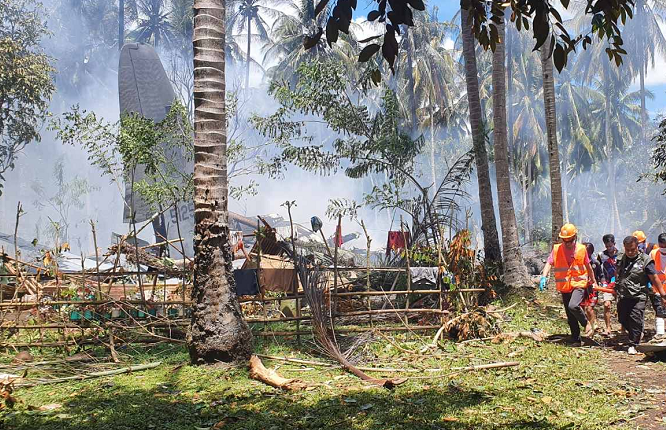 当地时间7月4日,菲律宾军方的一架C130运输机在南部苏禄省帕提库尔镇附近坠毁,机上当时搭载96人。该事故共计造成52人死亡,包括机上的49名士兵和地面上的3名平民。(总台记者 黄铮铮)