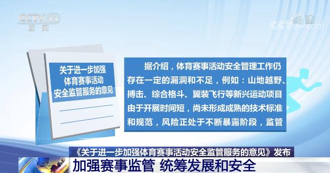 央视网消息:近日,国家体育总局等11个部门联合印发《关于进一步加强体育赛事活动安全监管服务的意见》。要求进一步明确各部门职责,强化监管举措,统筹发展和安全,牢牢守住体育赛事活动安全风险的底线。