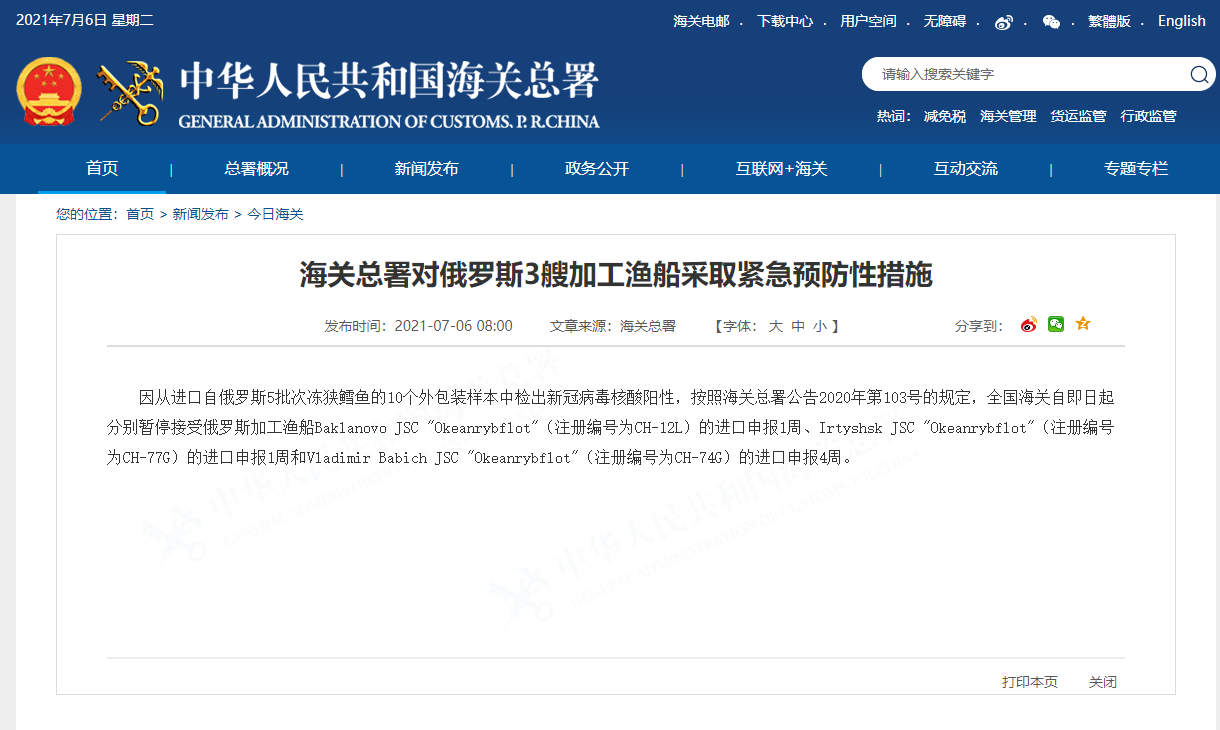 因从进口自俄罗斯5批次冻狭鳕鱼的10个外包装样本中检出新冠病毒核酸阳性,按照海关总署公告2020年第103号的规定,全国海关自即日起分别暂停接受俄罗斯加工渔船Baklanovo JSC "Okeanrybflot"(注册编号为CH-12L)的进口申报1周、Irtyshsk JSC "Okeanrybflot"(注册编号为CH-77G)的进口申报1周和Vladimir Babich JSC "Okeanrybflot"(注册编号为CH-74G)的进口申报4周。