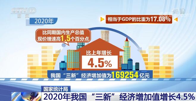 央视网消息:国家统计局今天(7月6日)上午最新公布的数据显示,2020年,我国新产业、新业态、新商业模式仍继续保持增长,“三新”经济增加值比上年增长4.5%。