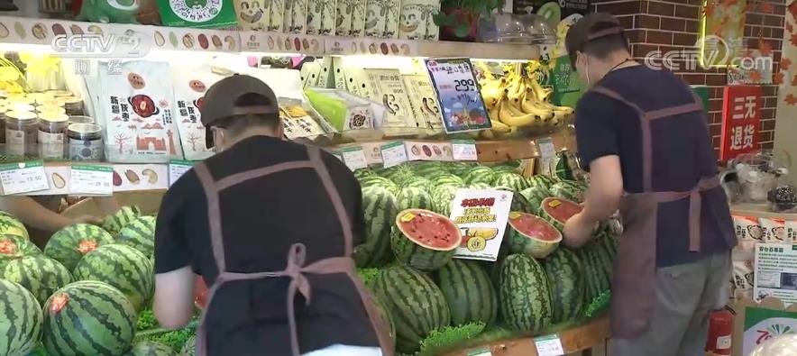 杨文凤介绍说,今年夏季水果的主要产区生产形势较好,不少果农扩大了种植规模,西瓜、葡萄连续增产、集中上市。目前他们店每天上货量1200公斤,比较上月增加20%以上,价格比较上月有15%—40%的降幅。