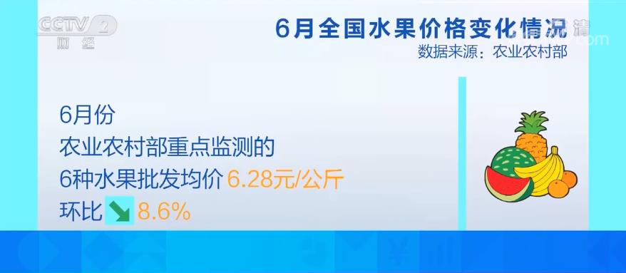 数据显示,6月份农业农村部重点监测的6种水果批发均价每公斤6.28元,环比下降8.6%。