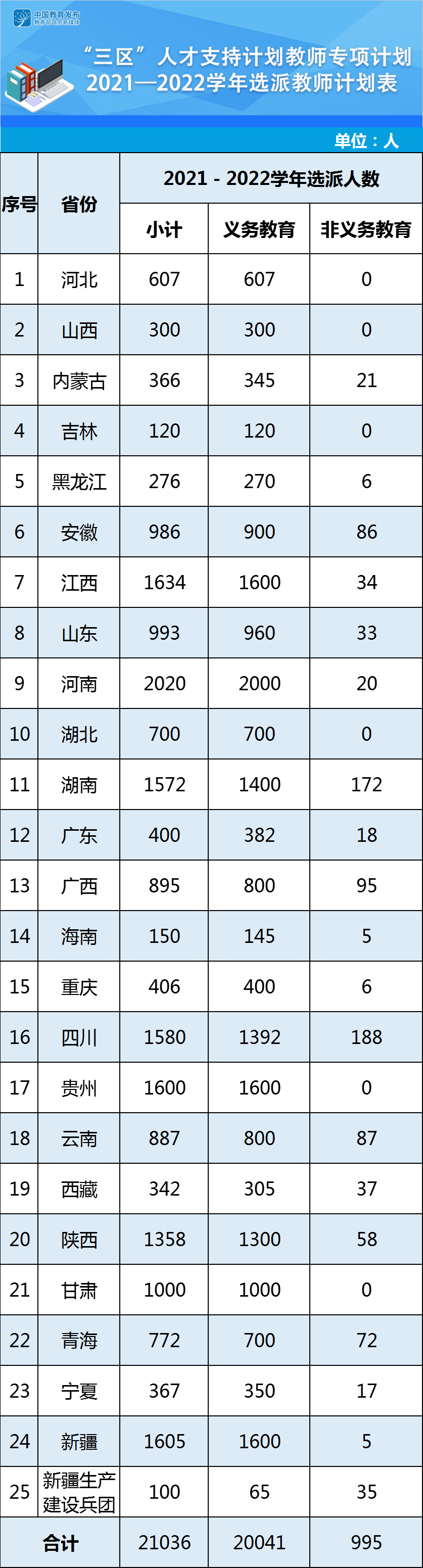 (二)选派数量。2021—2022学年全国计划选派21036名教师,其中义务教育阶段计划选派20041名,非义务教育阶段计划选派995名。各项目省要优化省内名额分配,加大跨县跨地市选派力度,充分调动省会城市、中心城市的优质资源,加强对所辖原深度贫困县支持。各项目省(区、市)和新疆生产建设兵团选派名额详见附件。