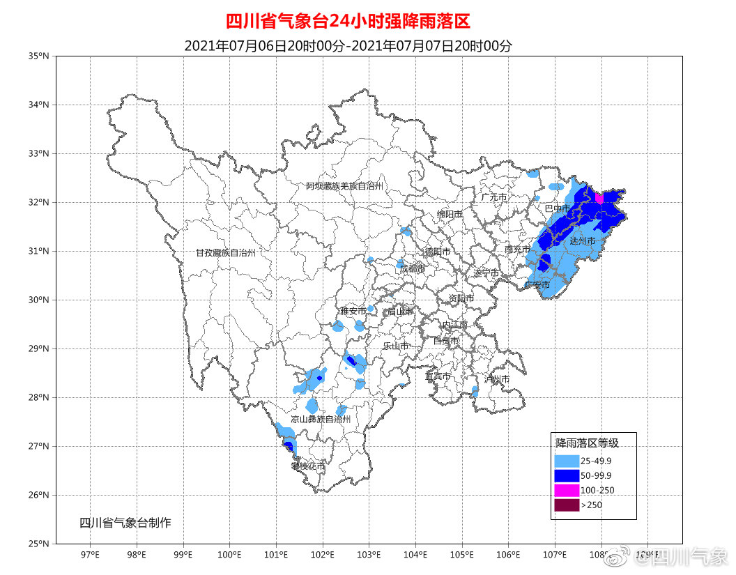 四川省气象台7月6日16时00分发布暴雨蓝色预警:6日20时到7日20时,达州、广安2市和巴中东部、南充东部有分散性的大雨到暴雨(雨量30~70毫米),局地有大暴雨(雨量120~150毫米),凉山州北部、攀枝花市北部、甘孜州南部有分散的大雨、个别暴雨(雨量25~60毫米)。