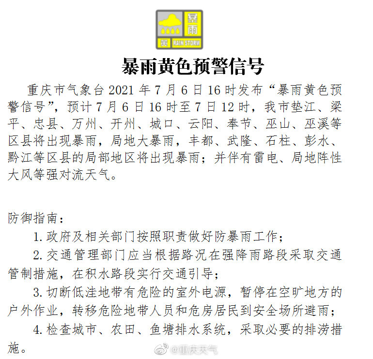 重庆市气象台2021年7月6日16时发布“暴雨黄色预警信号”,预计7月6日16时至7日12时,重庆市垫江、梁平、忠县、万州、开州、城口、云阳、奉节、巫山、巫溪等区县将出现暴雨,局地大暴雨,丰都、武隆、石柱、彭水、黔江等区县的局部地区将出现暴雨;并伴有雷电、局地阵性大风等强对流天气。